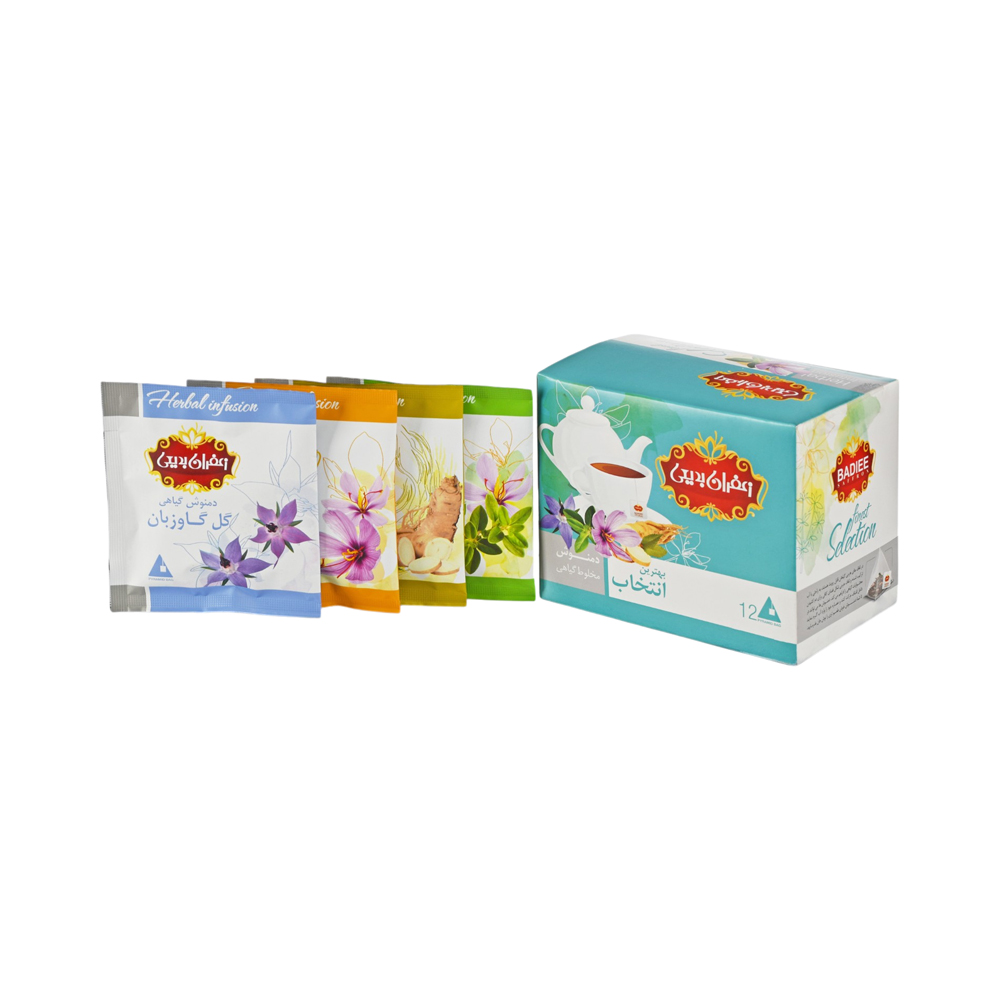 The Badiee Saffron Herbal Tea Selection consists of herbal teas with various flavors and aromas, including 12 envelopes of different teas. These include: